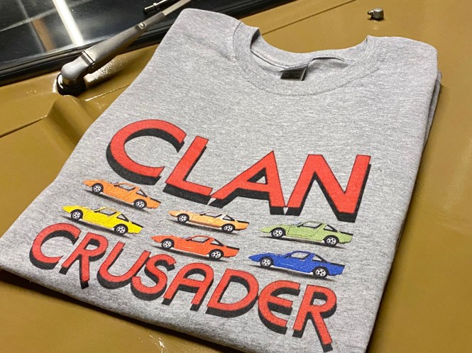 This t-shirt design is inspired by the style of the original Clan Motor Company advertising material, and features the full colour palette that cars were offered in, from the factory in Washington Newtown.