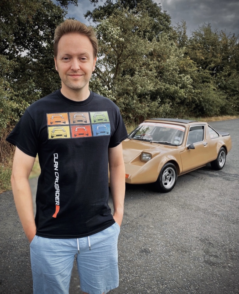 This t-shirt design is a modernised version of the Clan Crusader Original shirt, which takes its inspiration from the style of the original Clan Motor Company promo material, and features the full colour palette the cars were available in from the factory in Washington Newtown.